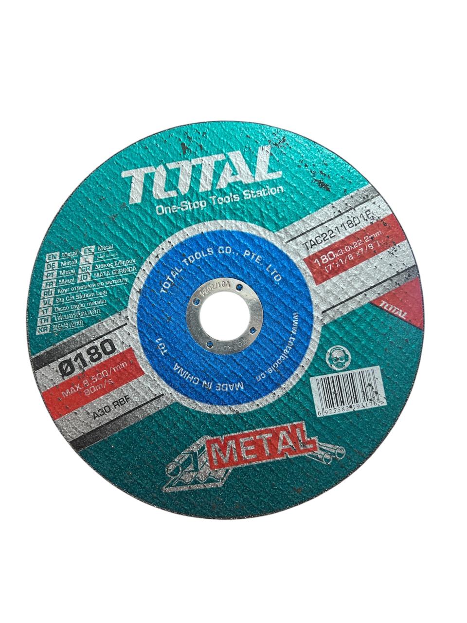 Disco abrasivo Total 7 pulgadas diseñado para el corte de metales utilizando amoladoras o esmeriles angulares estándar. Fabricado para realizar cortes uniformes y consistentes en perfiles metálicos, chapas y tuberías, este disco es adecuado para aplicaciones en talleres, construcción y mantenimiento donde se requiere una herramienta de corte confiable.
