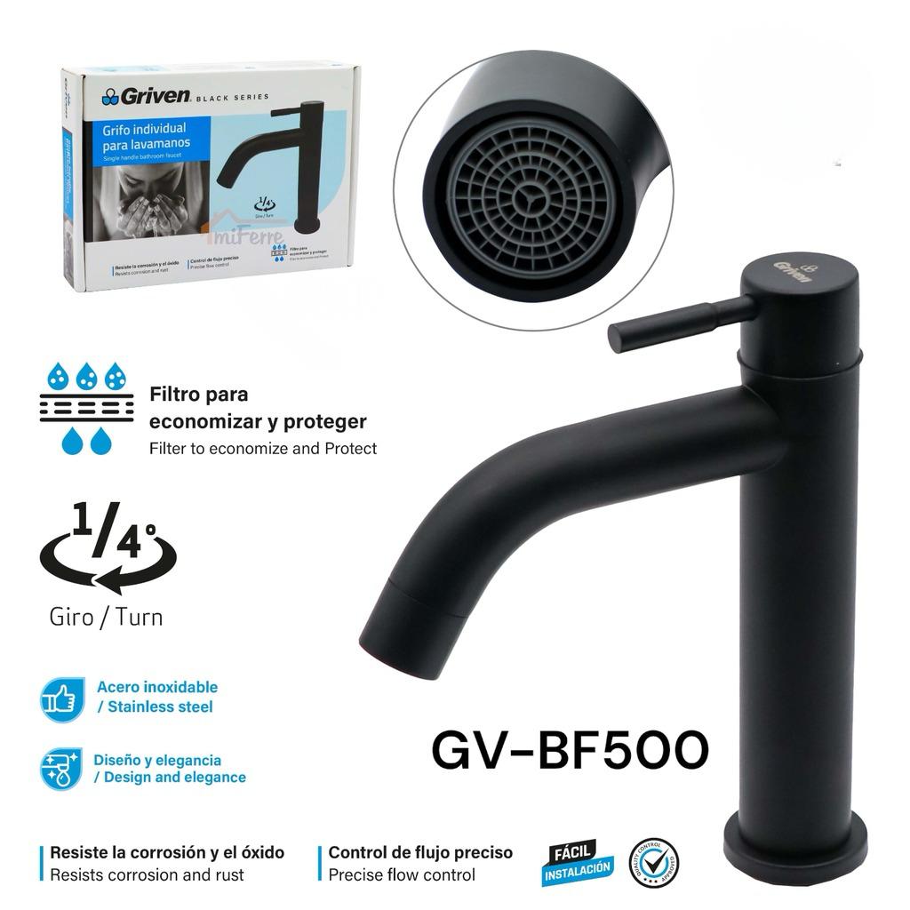 La llave sencilla para lavamanos Griven de cuello alto en acabado negro combina elegancia y funcionalidad. Su diseño moderno es ideal para baños contemporáneos, permitiendo un flujo de agua cómodo y eficiente, especialmente en lavamanos tipo bowl o elevados.
